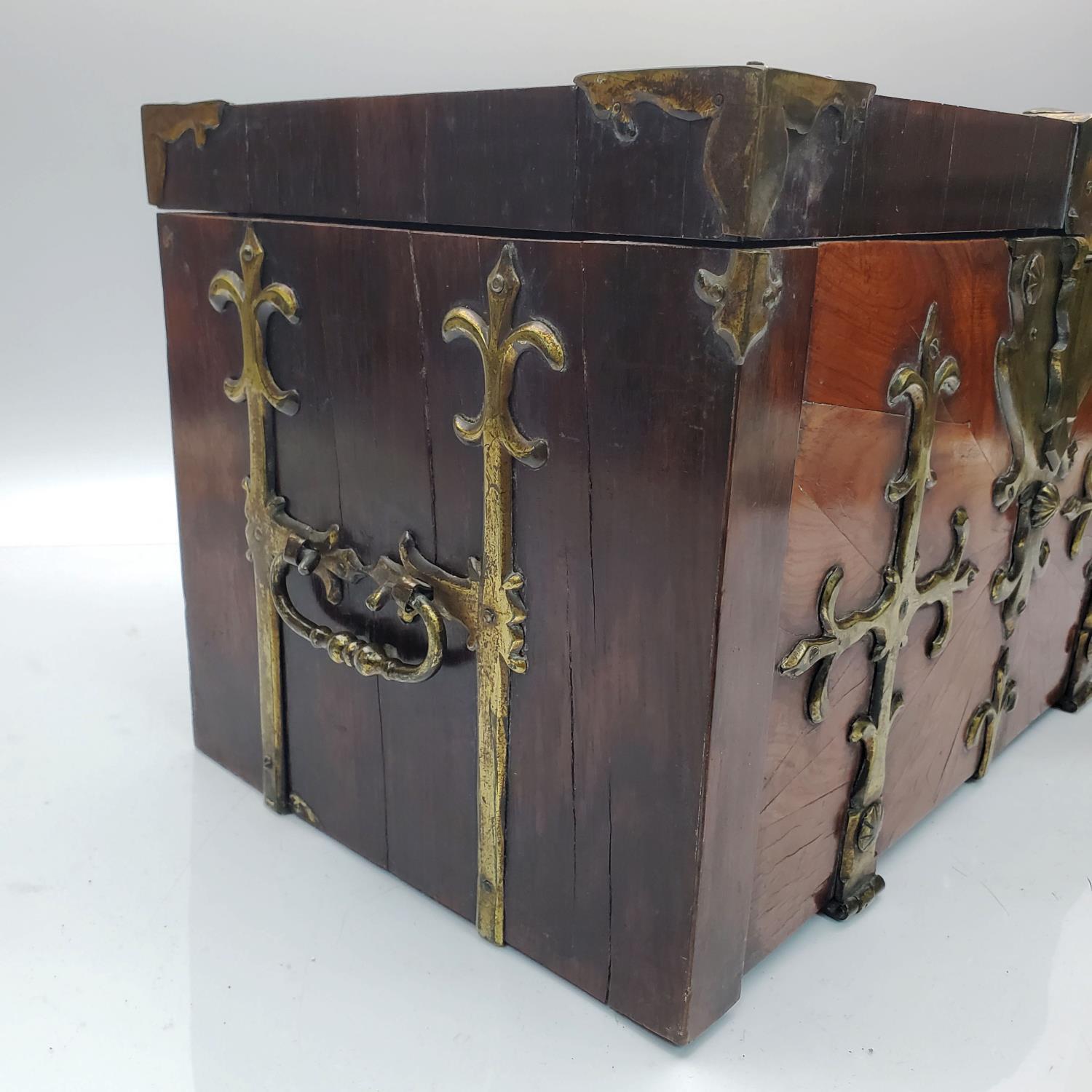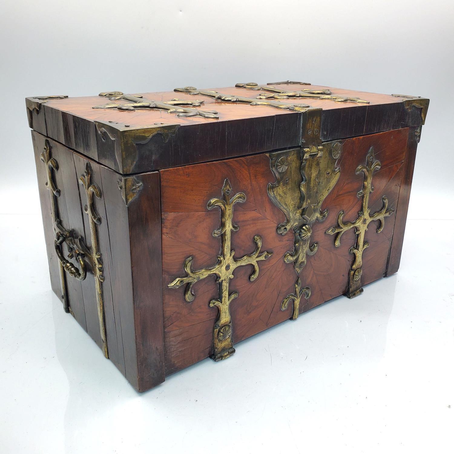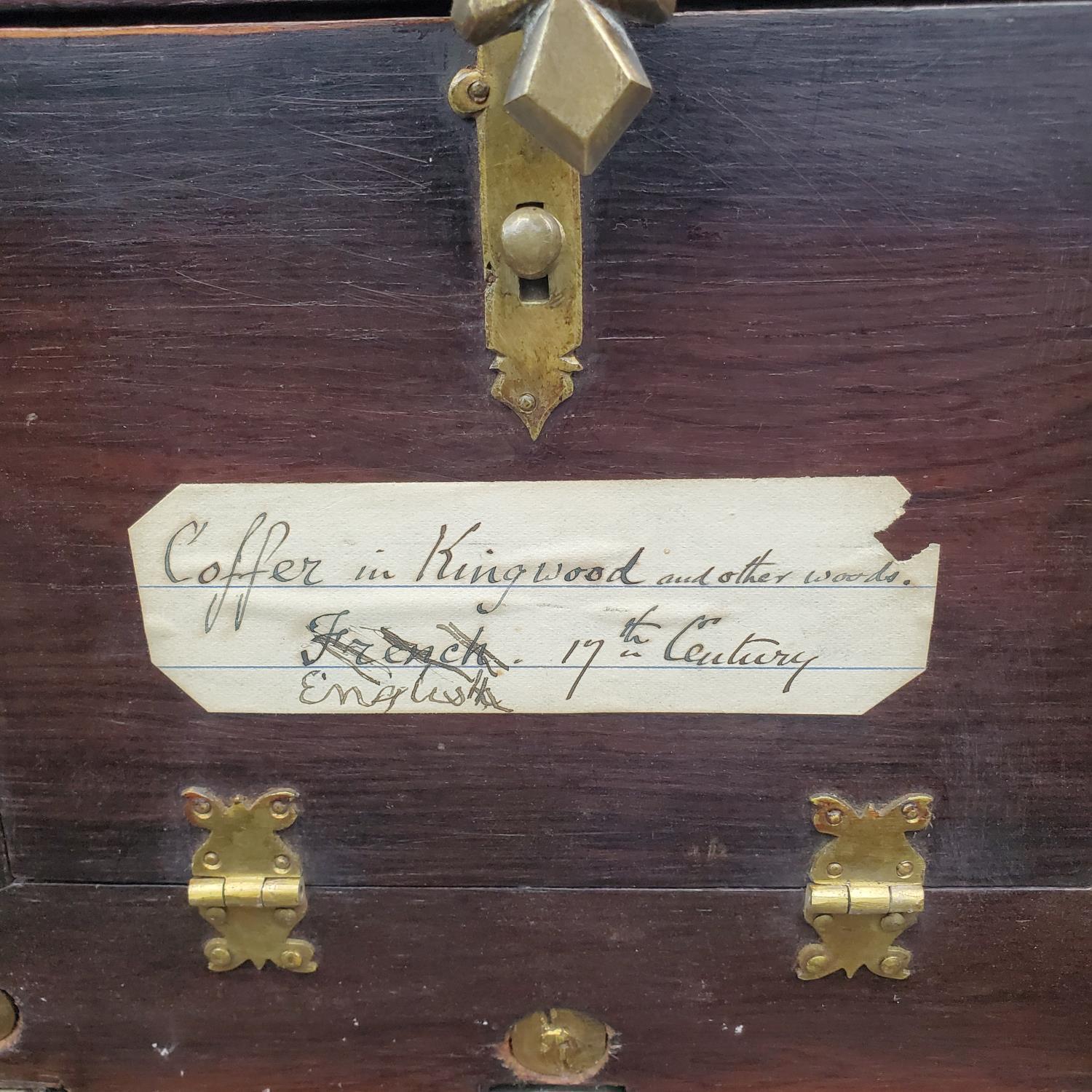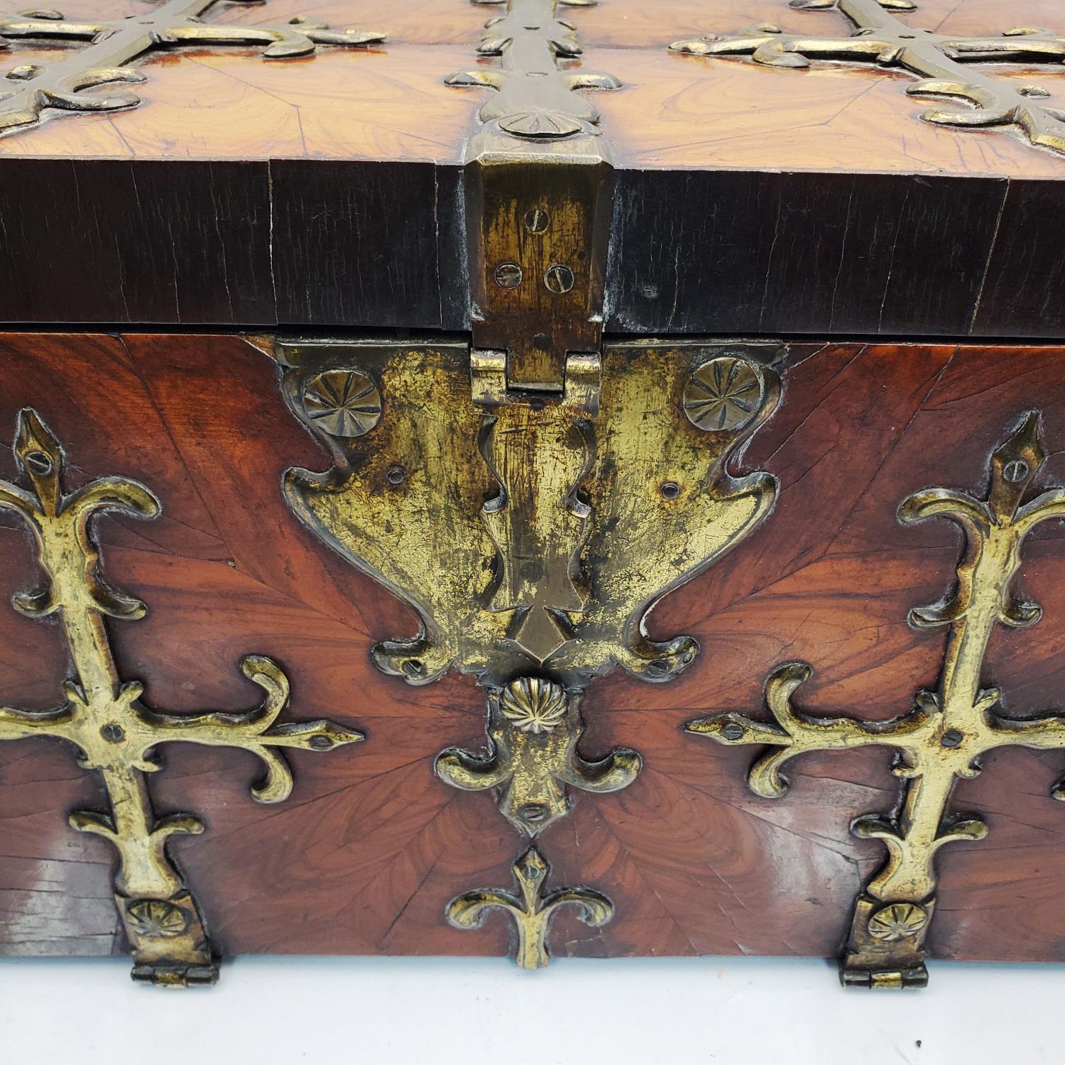 Late 17th century English coffre fort in oyster kingwood with brass hinges and straps. Totally original in excellent condition with a few missing brass nails. 15"wide x 9"deep x 9"tall, $7500.00