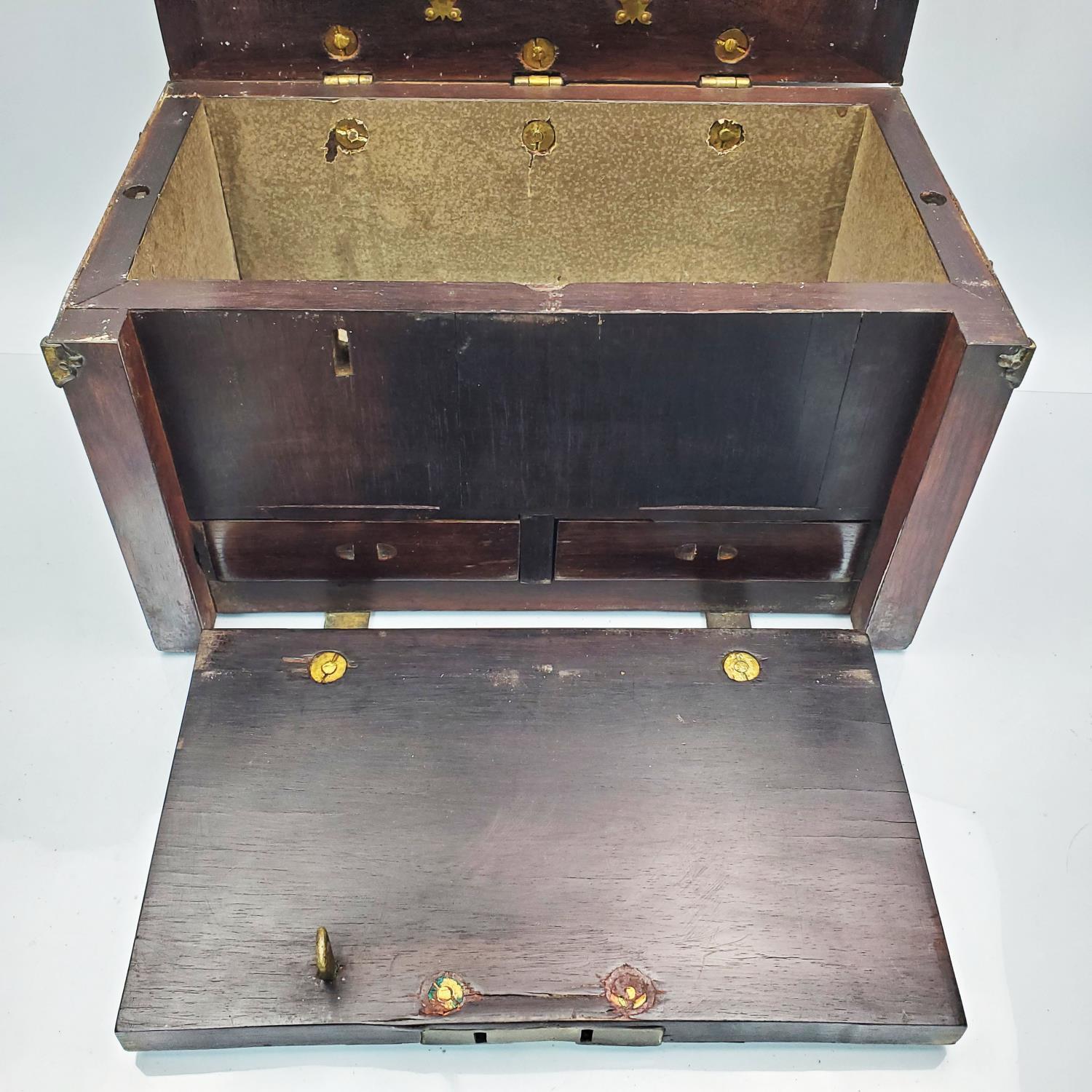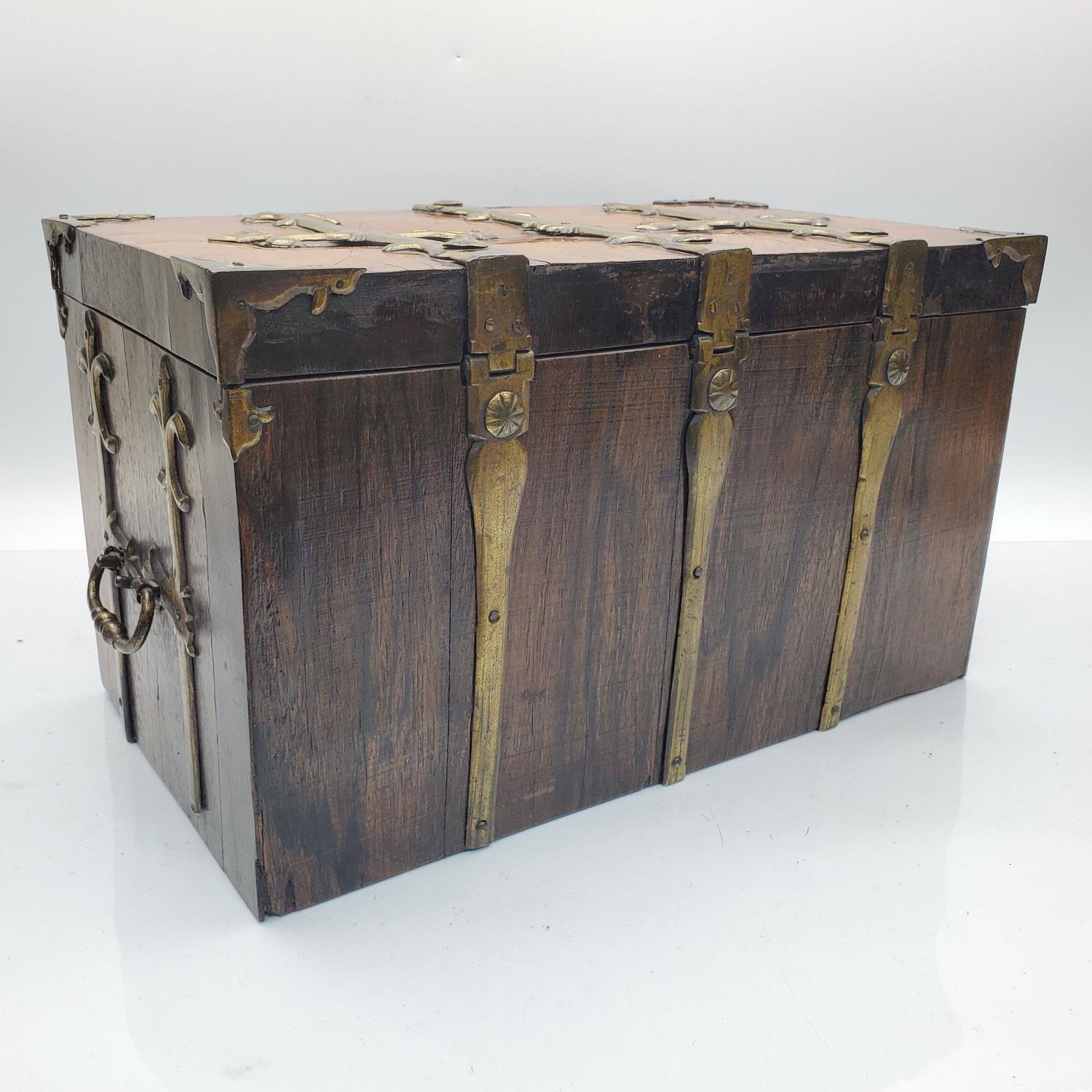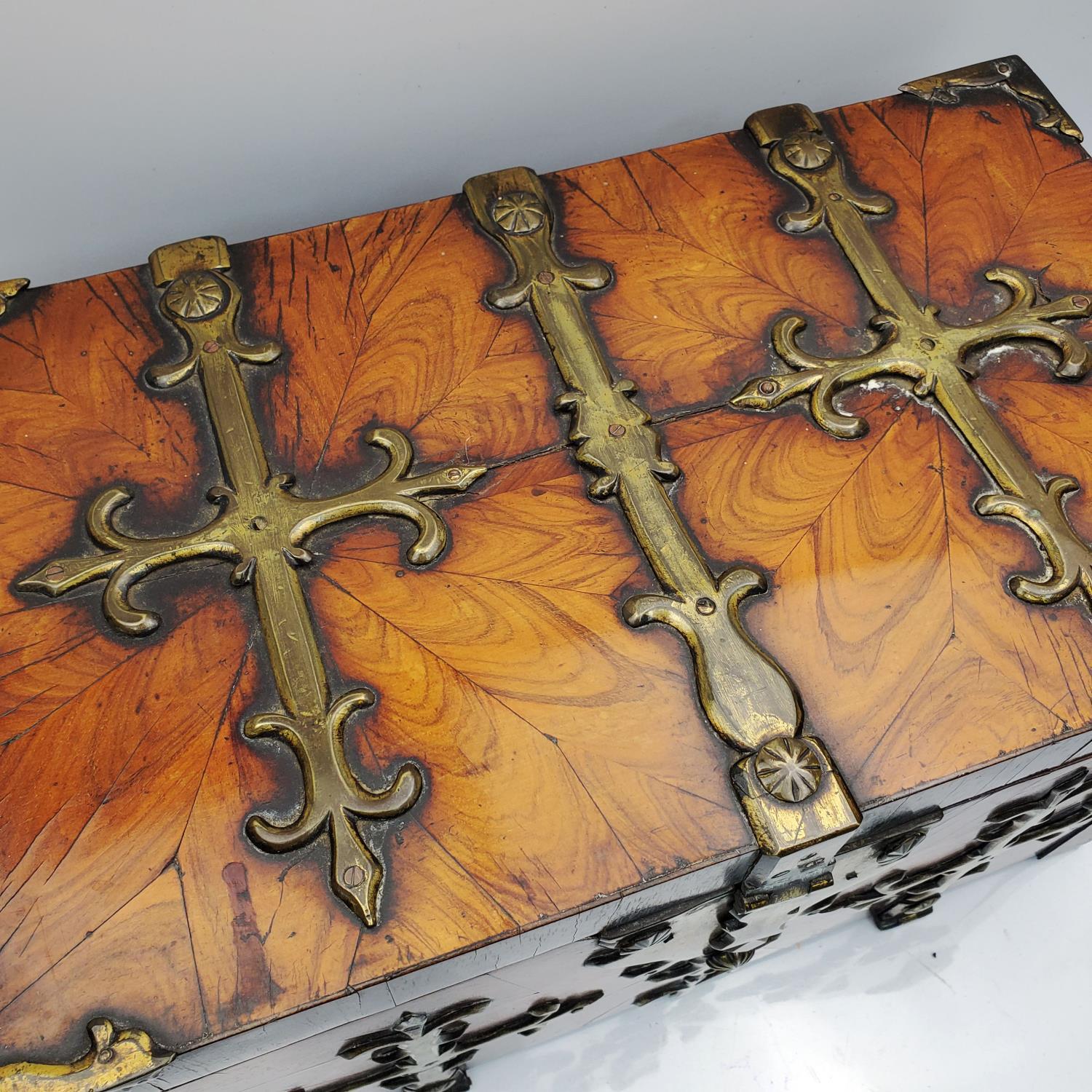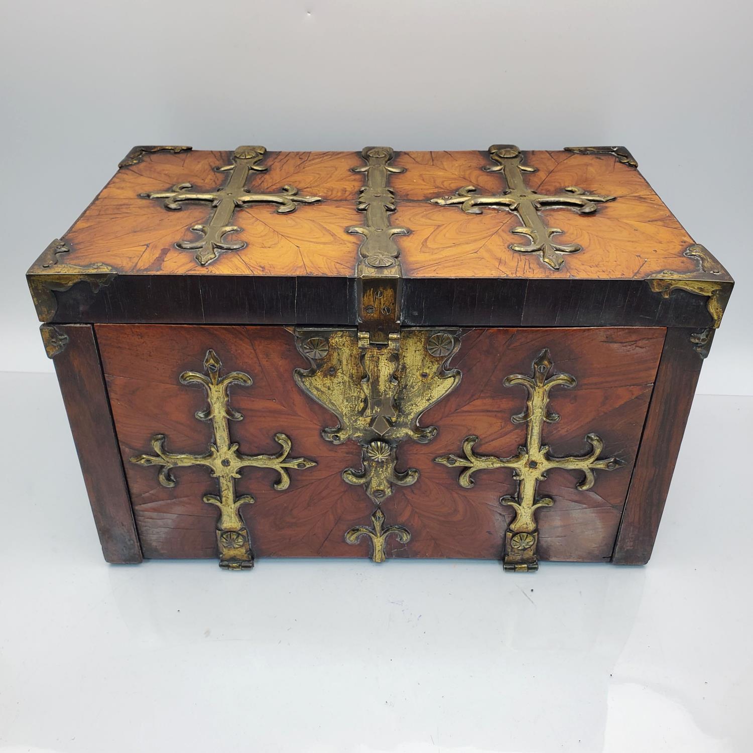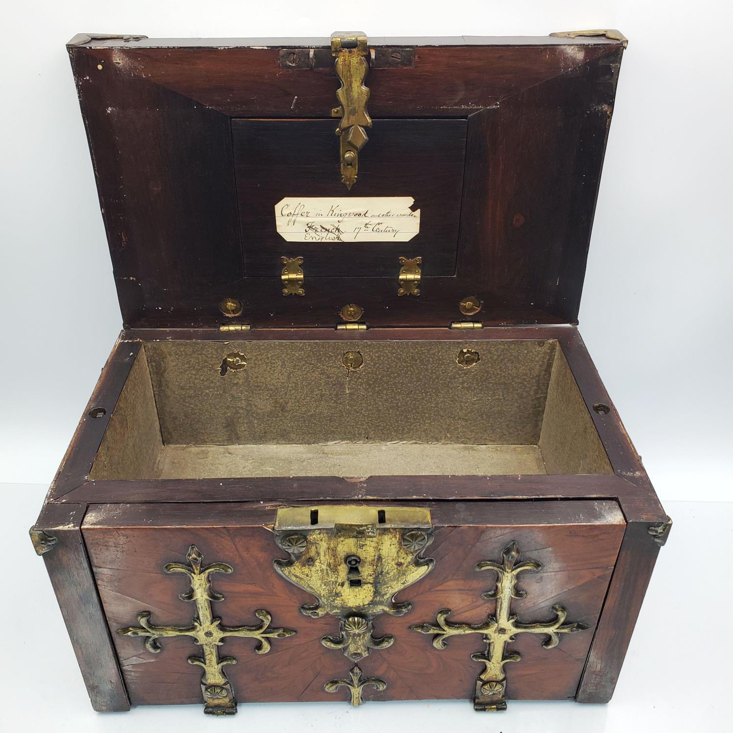 Late 17th century English coffre fort in oyster kingwood with brass hinges and straps. Totally original in excellent condition with a few missing brass nails. 15"wide x 9"deep x 9"tall, $7500.00